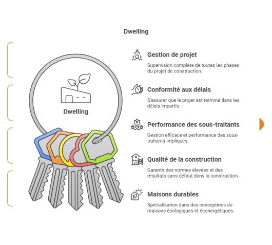 Dwelling est une entreprise générale de construction. En chef d’orchestre, elle assure toute la conduite de votre projet. De l’idée, en passant par le cahier des charges de la construction de la maison, le bâti, et le livrable, elle assure la gestion du chantier de A à Z. À ce titre, tout manquement peut lui être reproché, qu’il s’agisse du non-respect des délais, de la mauvaise performance des sous-traitants, ou des défauts de construction. Forte d’une expérience de plus de 20 ans dans le secteur de l’habitat résidentiel, Dwelling garantit la gestion de ces risques, et la livraison d’une maison conforme à vos envies dans les délais annoncés. L’entreprise belge conçoit des maisons passives, zéro énergie, sur-mesure, avec le matériau Cross Laminated Timber, dont la solidité et la fiabilité, est assurée. Tout ceci sera récapitulé dans le cahier des charges de contruction de votre maison que Dwelling vous aidera à constituer.