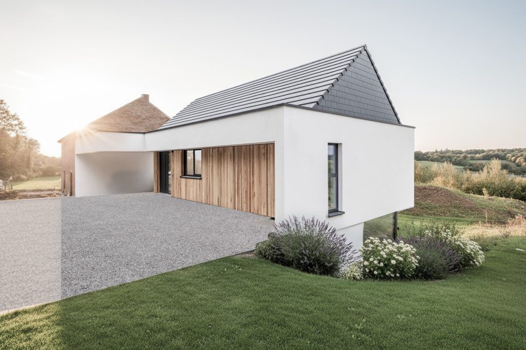 • Exemple de construction basse énergie signée Dwelling. Yvoir 2025 Bord de Meuse