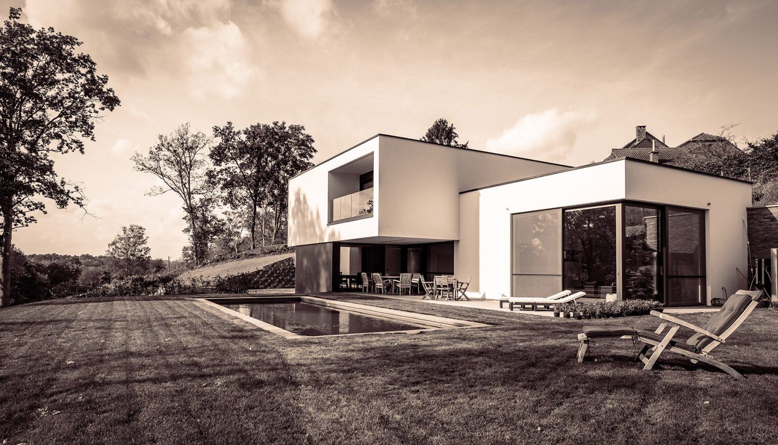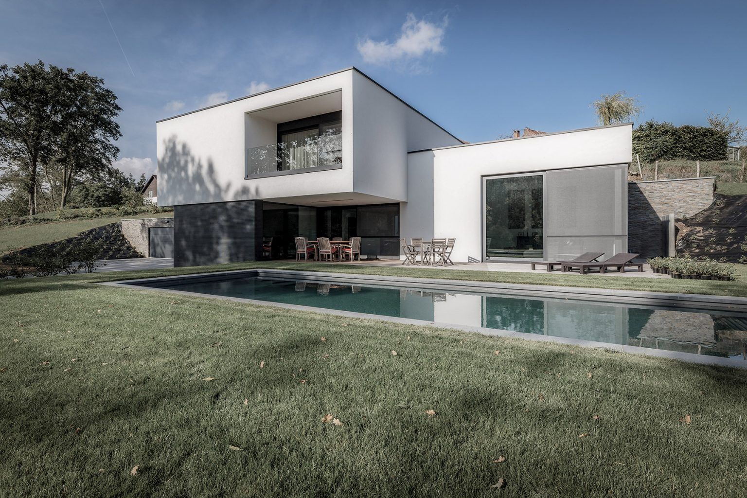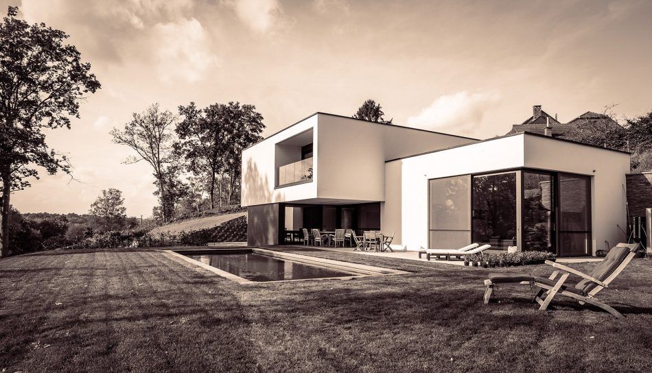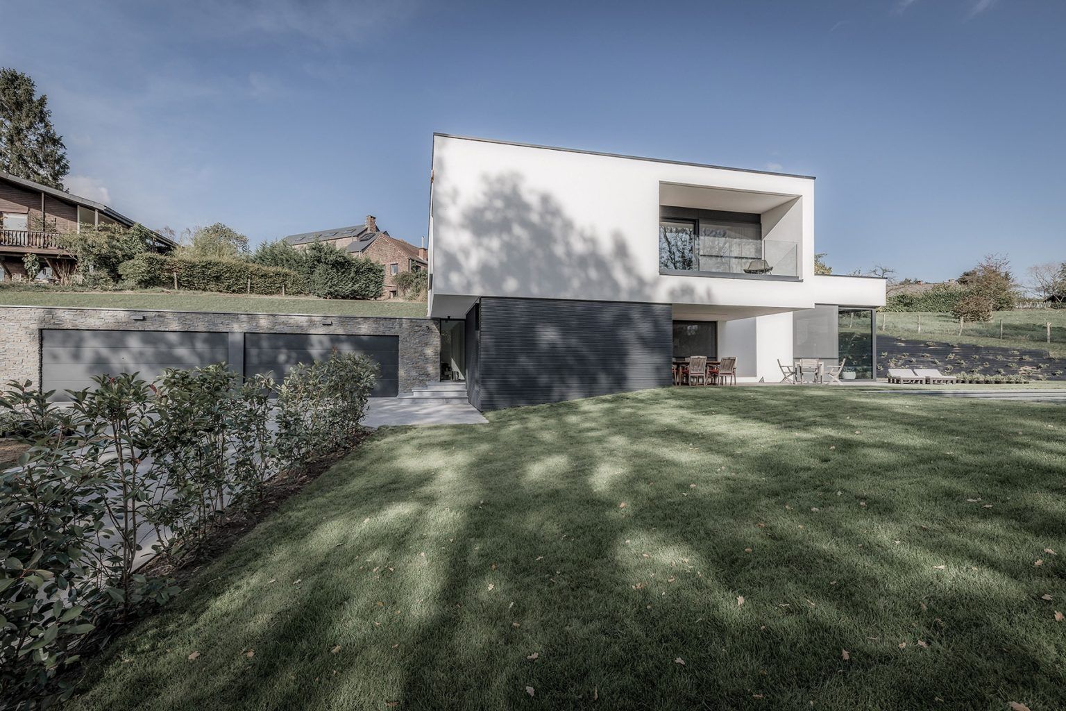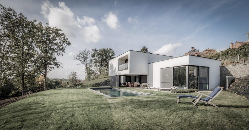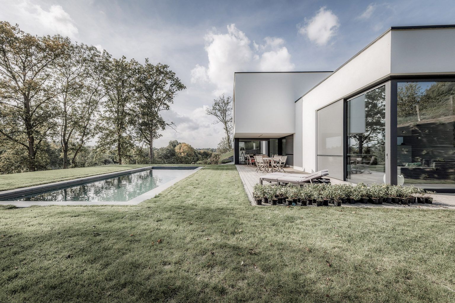ListingAvec une telle vue sur le vallon du Hèze et ce cadre privilégié, il fallait jouer la carte de l’intégration maximale ! Subtilité et discrétion ont donc dirigé la conception de cette maison. Une décision a été prise de la positionner toute en longueur – sur 32 mètres, parallèle aux courbes de niveaux. Enterrée d’un côté, entièrement ouverte sur l’extérieur de l’autre afin de profiter au mieux du paysage exceptionnel. Pour assurer la pénétration de la lumière naturelle dans tous les espaces de vie malgré la façade enterrée, un patio a été aménagé au niveau de la cuisine, côté colline.
