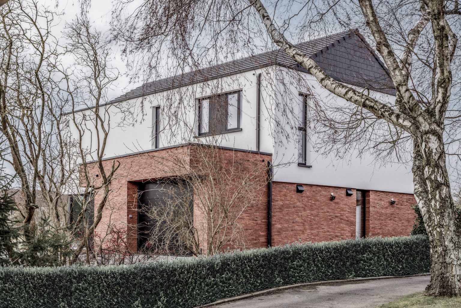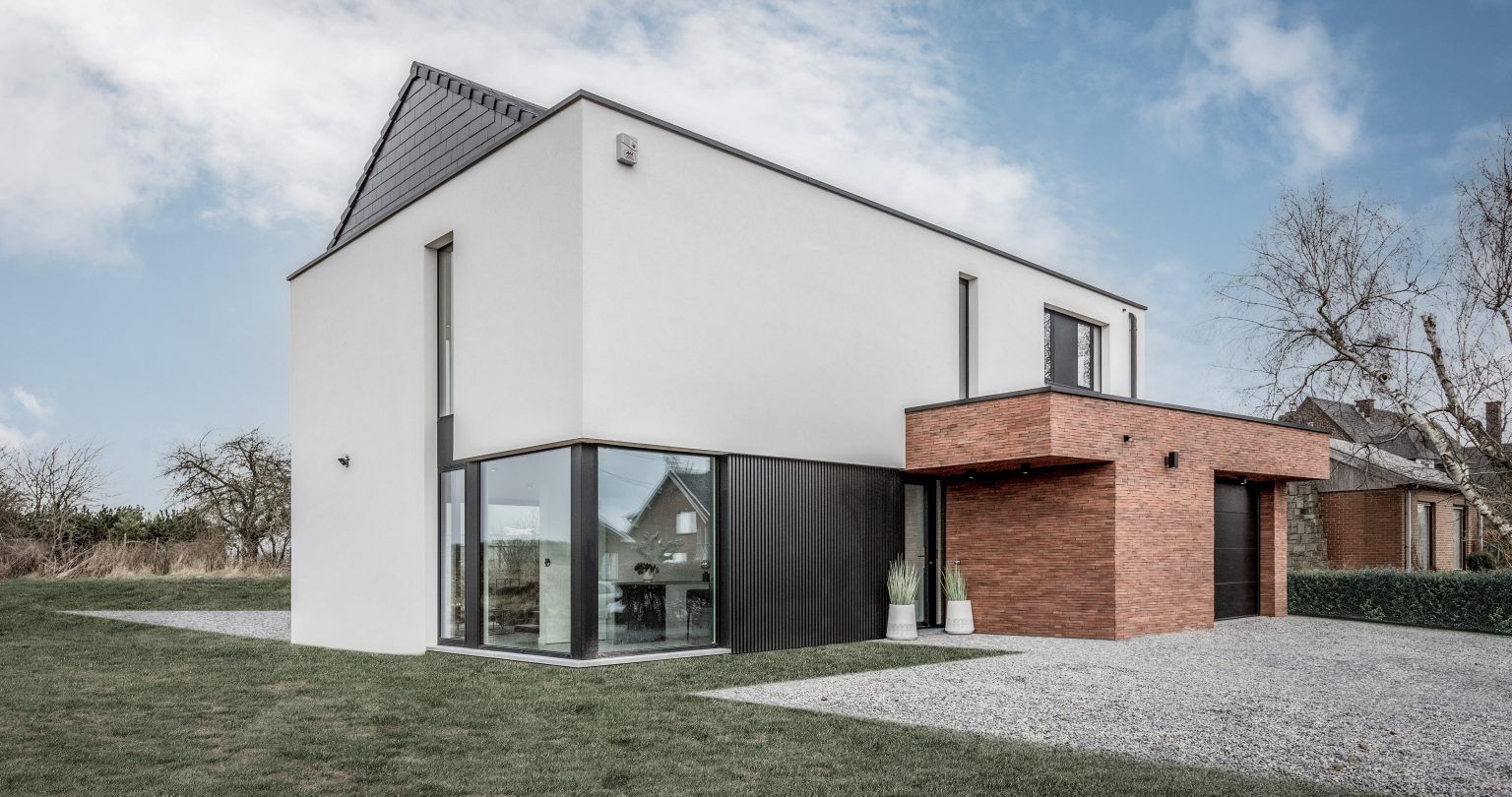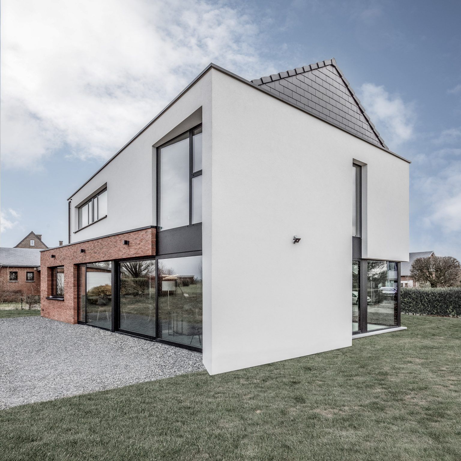 Une corniche périphérique avec rehausse d’acrotère a été réalisée pour obtenir un effet de toiture plate, malgré une obligation urbanistique de toiture à versants. Un crépi blanc et du bardage aluminium ont été ajoutés pour casser la monotonie des briques rouges non nuancées qui étaient imposées. Enfin, la dominante rectangulaire du volume principal a été « déstructurée » par des volumes secondaires en biais.