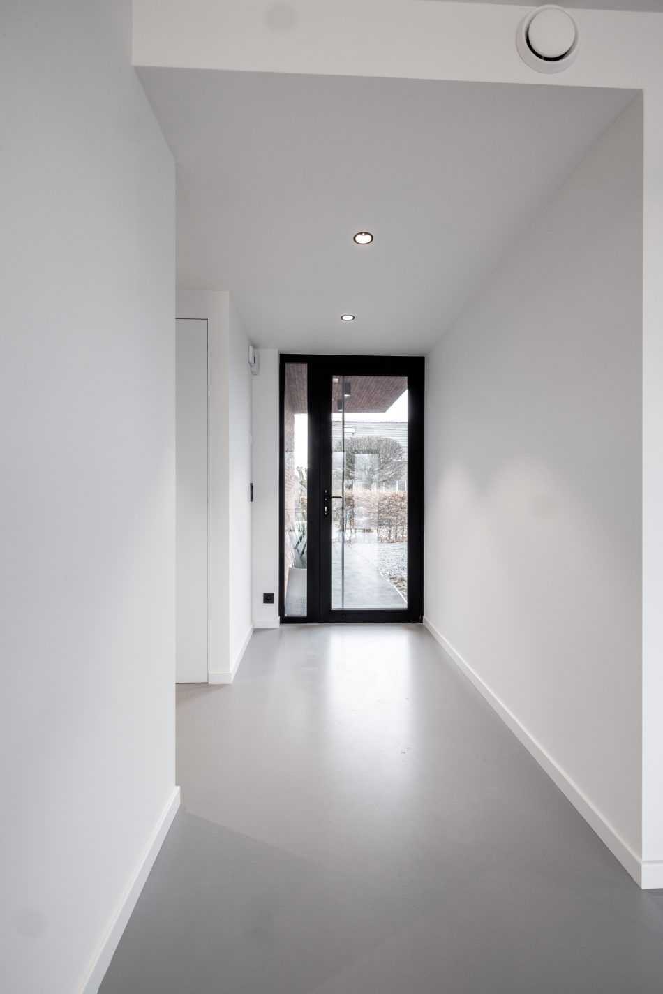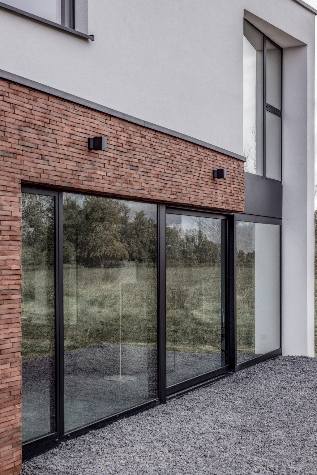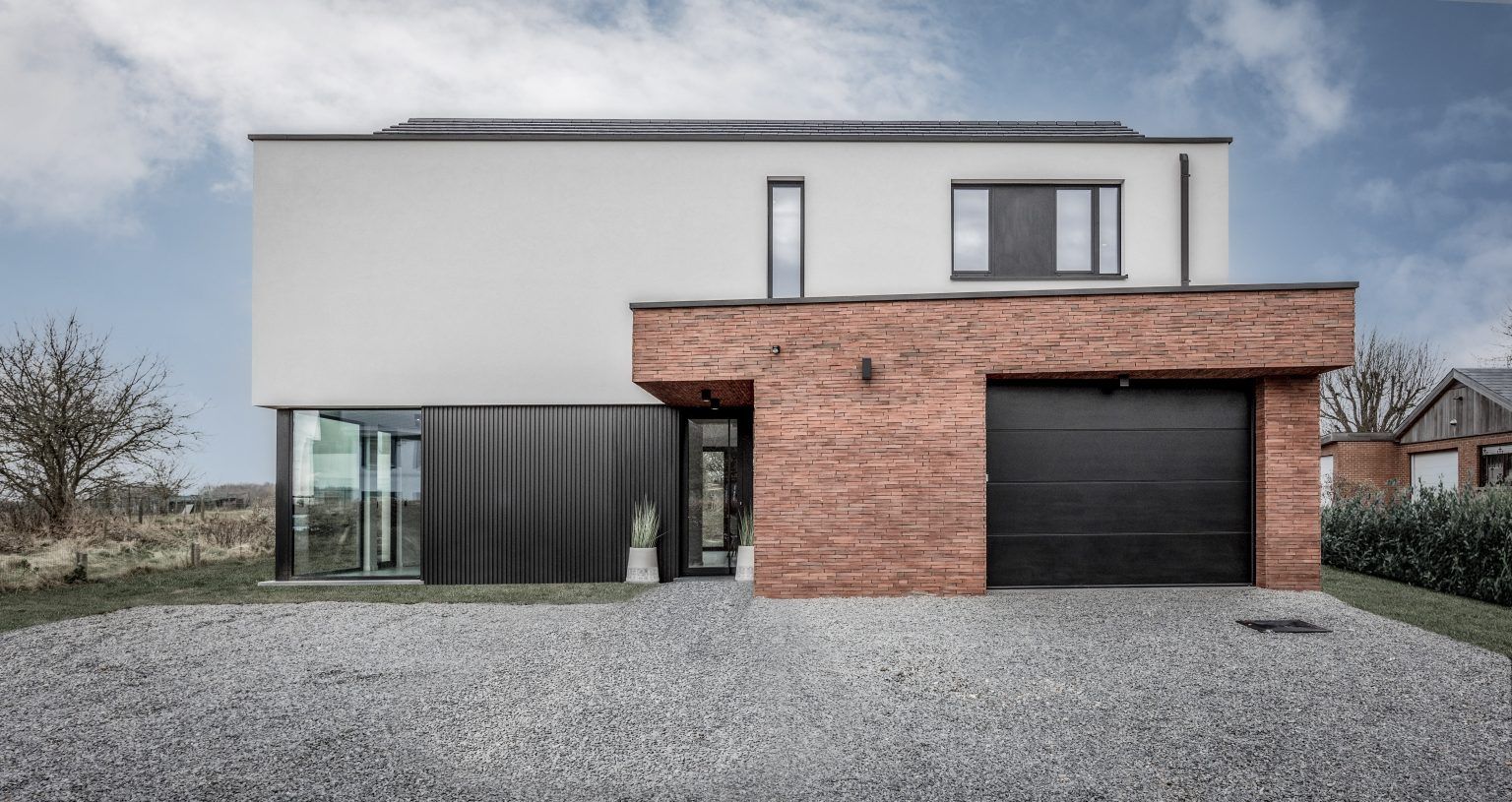 Une corniche périphérique avec rehausse d’acrotère a été réalisée pour obtenir un effet de toiture plate, malgré une obligation urbanistique de toiture à versants. Un crépi blanc et du bardage aluminium ont été ajoutés pour casser la monotonie des briques rouges non nuancées qui étaient imposées. Enfin, la dominante rectangulaire du volume principal a été « déstructurée » par des volumes secondaires en biais.