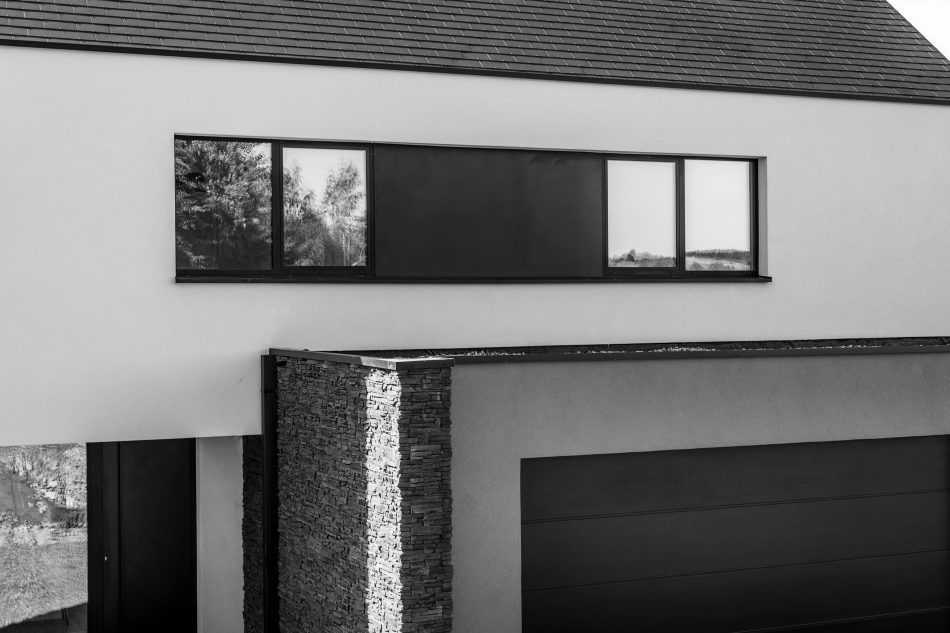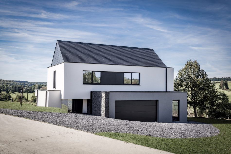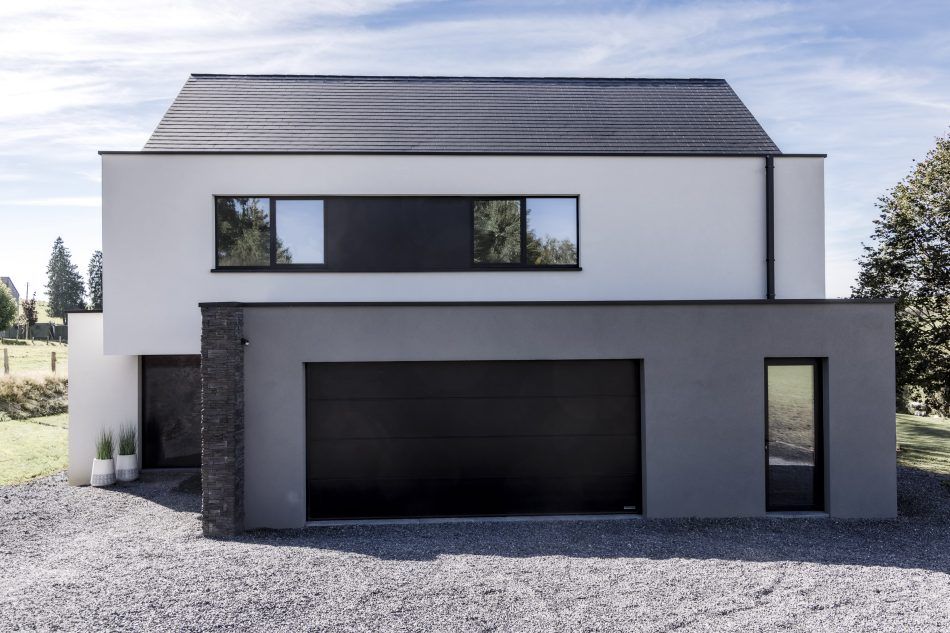 La silhouette rectangulaire de cette maison, habillée de blanc, de gris et de noir, donne une ambiance contemporaine, le tout, chapeauté par un toit en pente délicatement dessiné.