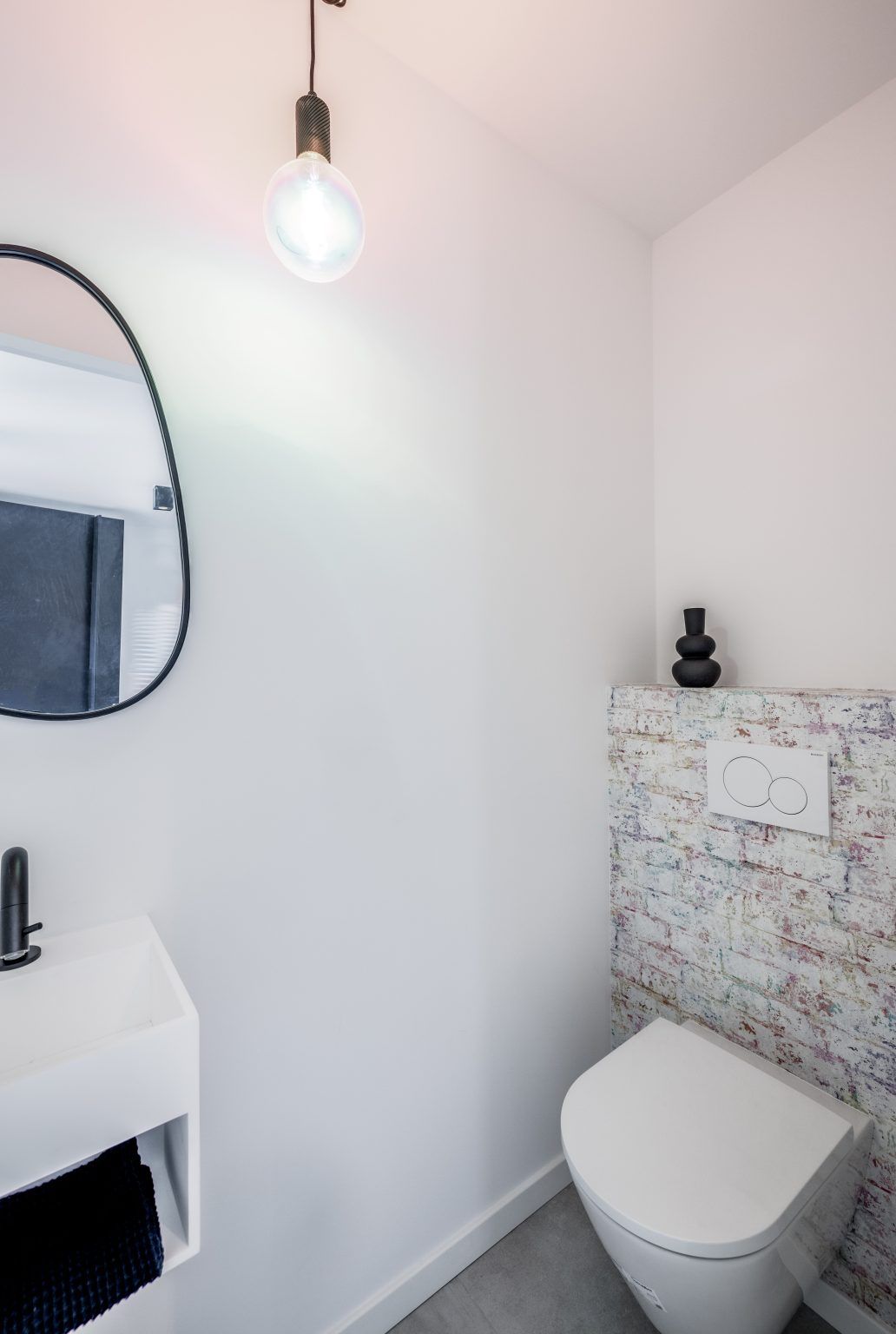 À l’intérieur, les espaces se veulent épurés et chaleureux. Les grandes baies vitrées nous invitent sur le monde extérieur, offrant des vues panoramiques sur les paysages bucoliques environnants. Elles permettent également à la lumière naturelle d’entrer et d’en baigner les pièces de vie.
