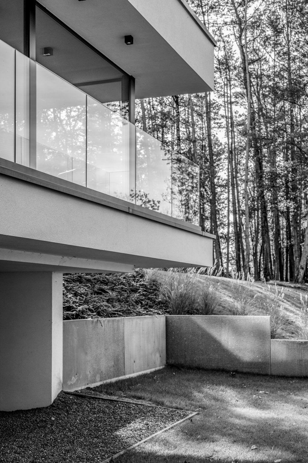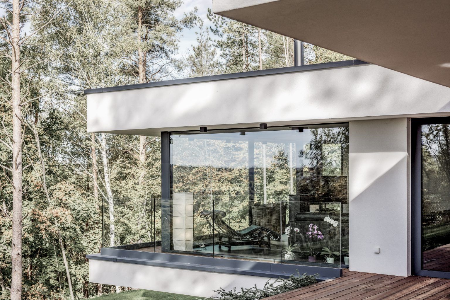 La maison se situe ainsi sur les hauteurs de Rochefort dans le très beau bois de la Boverie. Il aurait été dommage de ne pas profiter de cette situation exceptionnelle, même lorsque l’on est à l’intérieur de l’habitation. L’équipe Dwelling a donc réalisé cette maison avec un séjour entièrement vitré sur 20 mètres de long pour vivre en contact permanent avec la forêt. La terrasse couverte permet en outre de jouir de la splendide vue sur la vallée, même par temps de pluie.