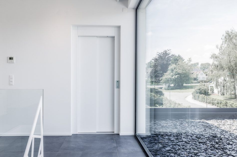 La maison a été conçue de manière à profiter au maximum de ce terrain en forte déclivité : la partie professionnelle s’installe au rez-de-chaussée, la zone de nuit au premier, et l’espace de vie au second. Un ascenseur distribue les différents niveaux. Véritable objet sculptural, l’escalier aboutit au milieu du salon.