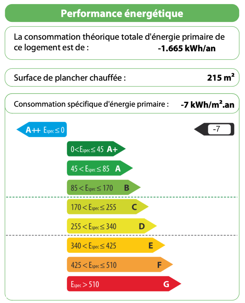 Grâce à une consommation spécifique d’énergie primaire négative (-7 kWh/m2.an), notre villa de Bothey a obtenu une certification A++ ! Il s’agit donc d’une maison dite à “énergie positive”, c’est à dire qu’elle produit plus d’énergie qu’elle n’en consomme !