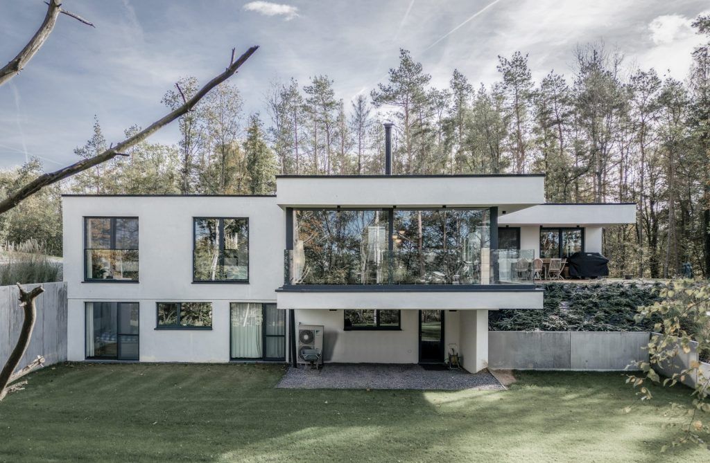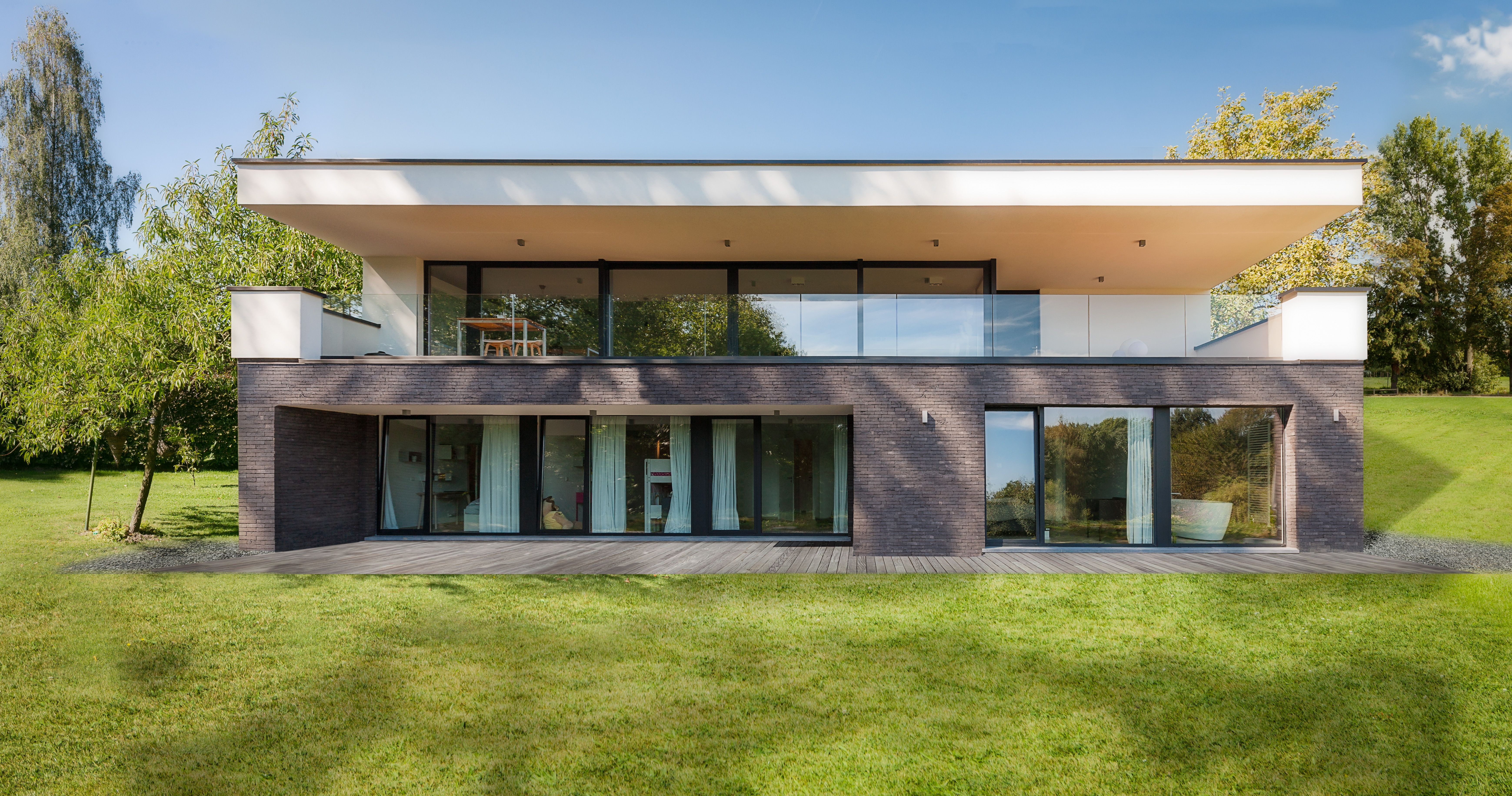 La façade d’une maison moderne comprend généralement plusieurs types de matériaux (bois, briques, aluminium, béton, éléments végétalisés, etc.) et alterne de longues parties ininterrompues avec de grandes surfaces vitrées.